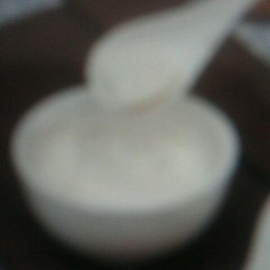 6.待牛奶冷却后,表面会结一层奶皮,用竹签轻轻掀起奶皮一角,慢慢地把牛奶倒装鸡蛋清的碗中。