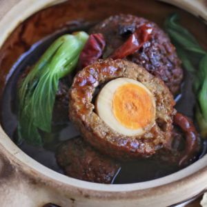锅中加入生抽老抽耗油清水,煮沸后放入葱段八角等料。放入炸好的肉丸,小火焖煮20~30分钟。最后用浇入水淀粉勾芡。