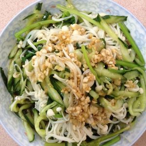 金针菇焯3分钟沥干水,青瓜加盐腌12分钟挤干水,把2样放盘子里,把配料调在碗里淋在金针菇和青瓜上,(家里没香油),把食油热了倒上面拌拌就可以吃了,清爽的小菜。。。