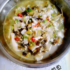 5、热锅内放油,放入姜丝,蒜片,小米椒爆香后,放酸菜炒,炒出酸菜的香味,加入可以没过酸菜鱼片量的清水或高汤,至水开后放入鱼片,加少许盐和鸡精,待水再次开后,就可以出锅了。