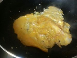菜最多炒一分钟,放入鸡蛋液,摊成蛋饼。