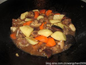 再将荸荠、马铃薯、红萝卜、海参,放入锅中续焖约20分钟,至排骨熟软,大火收汁。