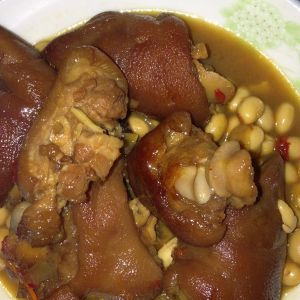 将猪蹄倒入沙锅中,放入黄豆,大火烧开后转小火炖1至2小时左右,也可以使用高压锅,用筷子可以轻松插透猪蹄即可