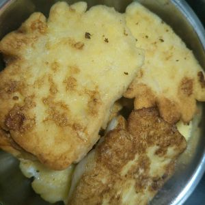 锅里放少许油,馒头片均匀的沾上鸡蛋液,煎至两面金黄就可以吃了 。
