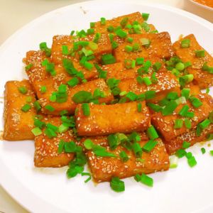 豆腐切成条块状,擦干水份。平底锅热油,油热后放入豆腐块小火慢煎