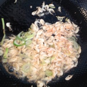 虾皮洗净挤干水份。热油锅下入葱末和虾皮一同翻炒出香味。