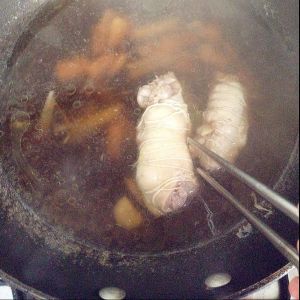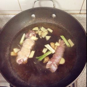 将腌好的鸭肉用棉线缠紧,放入冷水锅中,加姜片,葱段、料酒、生抽、盐,大火煮至开锅后转中小火,在煮10分钟,关火再焖5分钟。用筷子戳透鸭肉,若流出清澈液体就表明熟了