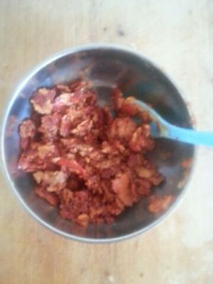 把红枣枸杞洗干净,红枣去核,一起掂碎了。