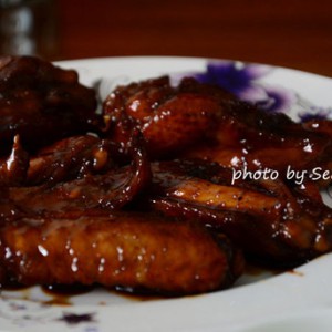 小火慢炖,要不断翻转鸡翅,这个过程比较慢,可能需要15分钟。待汤汁很浓稠时,放入少许味精,然后开大火上色收汁儿,盛盘即可。