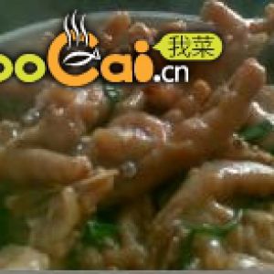 凤爪用油煎一下至金黄色,然后倒酱油、加盐、将红辣椒放入,再加水浸过凤爪,盖上盖子中火焖20分钟左右。