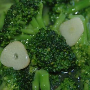 西兰花洗净,根去掉,掰成小朵,蒜切片。