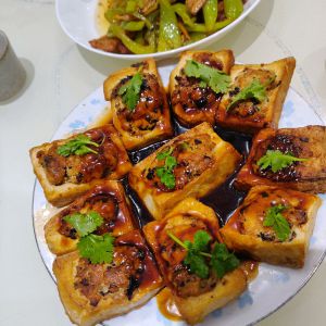 豆腐切块,并把将豆腐挖出一部分。用于放馅料
