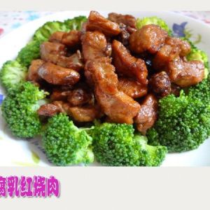 辣锅倒入适量的食用油,辣锅后倒入冰糖开小火将冰糖炒化。接着倒入猪肉炒至变色。接着放入豆腐乳,加入八角炒至上色。接着倒入少量的水,待水收干,倒入适量的盐味精。准备起锅。西兰花倒入水中,放入少量的盐。煮得八分熟,起锅摆盘。