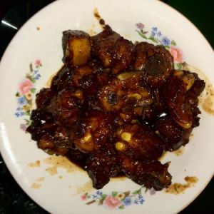 锅里加多点油,烧热。将腌制的排骨放到锅中炸。炸过把油滤出,将之前烧排骨的汤和腌料都倒入锅里一起烧。