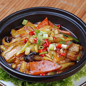 盛进事先烧烫的小砂锅(煲仔)内。 淋上辣油后加砂锅盖,小火焖5分钟,撒葱花趁热上桌即可食用
