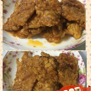 腌制好的肉片先裹一层面糊,再放入干面粉中压一层干面粉,抖掉多于的面粉后当油锅炸(闲麻烦可以省略),油温不能太热