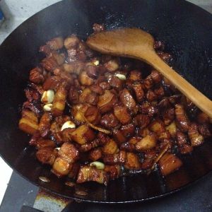 等油里冒出大泡泡,倒入五花肉翻炒。