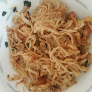 放入三勺油(尽量多点吧,太少了会粘锅)烫了之后把蛋打下去。把沥干的面也倒进去。翻炒。放入盐和酱油,味精。继续翻炒一下。放入蒜花。一碗香喷喷的炒面就出炉了。。。