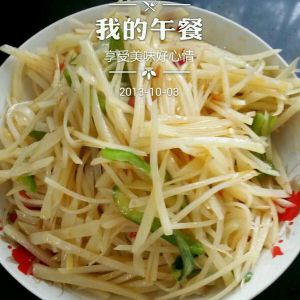 放点油,等油热了,放葱姜,在放少些豆瓣酱,在把土豆丝放入,炒至5分钟,在放少许盐,起锅时放少些醋