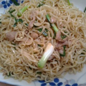 油锅下肉小火炒熟,加入蚝油、一点点盐、鸡精,葱段翻炒一下下,再倒入面条,把火开大些,炒炒匀后使可以出锅了。