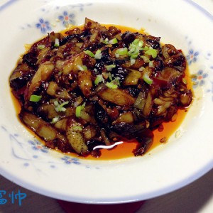 茄子捞出,大火将油烧热,再次放入茄子炸30秒,将茄子中的油逼出。捞出茄子条待用。
