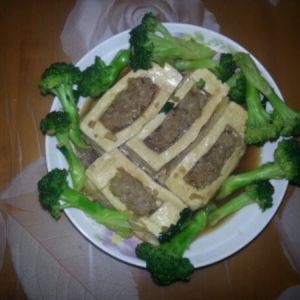 肉切成末,加盐,胡椒粉,姜,料酒,淀粉,糖,生抽,拌成肉馅。豆腐先用水焯一下,这样豆腐容易成型。用小刀把豆腐开槽,把肉馅放进去。