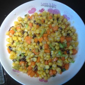 再放入玉米粒'松子放入些盐''翻炒