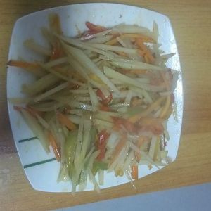 1.将土豆 尖椒 胡萝卜分别切丝备用