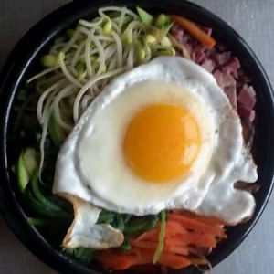 用平底锅摊好一个单面蛋,放到石锅拌饭上,最后把辣酱倒入适量鱼露拌匀后倒入石锅拌饭中。美味的韩式石锅拌饭就大功告成了!