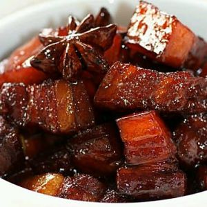 锅内倒油,6成热时加冰糖开小火炒出糖色,立即将肉倒入锅中翻炒至均匀裹上糖色。