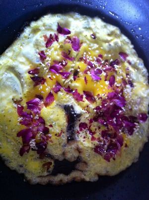 蛋饼煎的差不多时把玫瑰花瓣洒在上面
