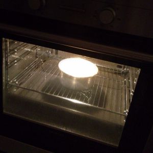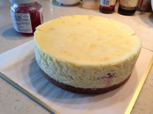 取出冻硬的饼干底模,将芝士面糊倒入模具内,再撒上新鲜草莓粒。烤箱预热,最底层插一装满水的烤盘,将模具放在倒第二层烤网上,于165度烘烤50分钟。