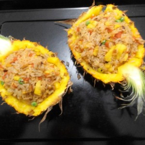 待米饭炒好装入菠萝壳里 再放烤箱烤8分钟左右 等香味出来就可以了