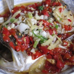 将鱼头从中间剖开,放入盘中,洒上花雕酒,鱼头上放剁椒,姜,葱,放入锅中蒸15-20分钟