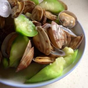 丝瓜洗净去皮滚刀切块。花蛤放在盐水中吐水,时间1-2小时。