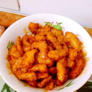 锅里放油待油热至八成熟放入挂了面糊的里脊肉稍微炸会,捞出,继续加热油至九成热再二次炸里脊肉,这样会脆些