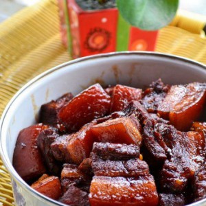 锅中放少量老抽再把块肉放入翻炒,加热水浸没块肉烧滚,加香叶一张茴香一朵,姜片,葱结,料酒,改中小火烧30分钟,加盐少量、糖烧十分钟,最后开大火收汁。我没有像别人先放糖烧,而是用了家传土方法!