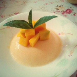 最后把用盘子倒扣过来,放芒果丁装饰。薄荷叶
