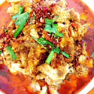 最后一步,在鱼上面撒一层孜然和辣椒粉,摆好葱段,有香菜更好,家里有花椒面或者胡椒粉都可以撒一点,锅里烧热油,浇入,滋啦一声香,开动吧!不需要加盐,因为豆瓣很咸,而且鱼的腌制中已经放入了盐了!起锅时可以撒点鸡精