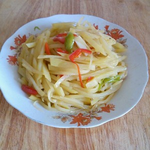 倒入土豆和青红椒丝翻炒,调入生抽和少量白糖快速翻炒至土豆透明(土豆粘锅可以撒少量开水)。