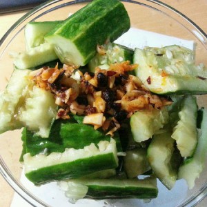拍好的黄瓜装碗,依次淋上芝麻油,酱油,陈醋和炒香的蒜蓉拌匀。还可加入老干妈,味道更佳哦!