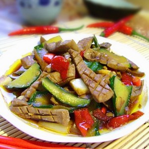 入油炒黄瓜片刻放入腰花,剁椒,蒜瓣,盐和鸡精。最后勾芡即可。