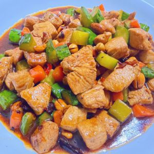 再加入鸡丁炒匀,最后加入黄瓜丁和花生翻炒均匀