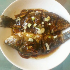 放煎好的鱼,再把调好的调味汁倒入,加一碗热水没过鱼身
