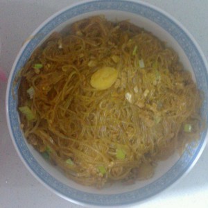 放入一勺香其酱'然后放肉末'加入酱油等调料'最后放入粉丝不停翻炒'出锅前加少许葱花