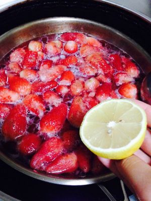 煮开后,转中火继续煮,直到草莓煮熟,挤入柠檬汁,糖和柠檬按照自己口味调整