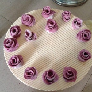 然后将紫薯与刚才的面团揉合在一起,在等待发酵