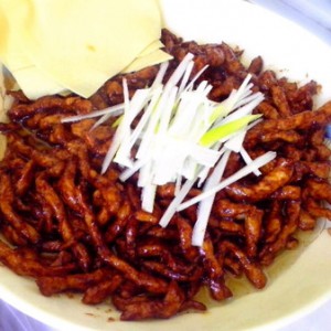 锅中放油烧热,大火,下肉丝炒散,至肉丝发白,