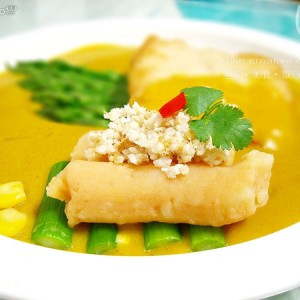 嫩煎青鱼配咖喱牛奶汁和芦笋鱼松色拉