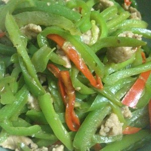 青椒炒一分钟后将肉加进去,炒熟即可。